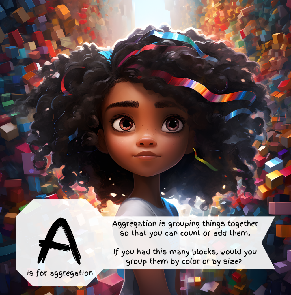 Let’s start with the illustration for aggregation. This is the same image that we see on the cover of the book. It’s an illustration of a girl framed by an explosion of building blocks. It’s difficult to look past the piercing gaze of those intelligent eyes, but the link to aggregation is the blocks. As a child and later as a father, I spent a lot of time playing with different types of building blocks. Some people can just dump all of the pieces together in a big pile and find the piece that they need amidst the chaos. Not me. I prefer to sort the blocks into different piles—either by color or shape. Placing things into different groups based on a similar characteristic like color or shape is aggregation.