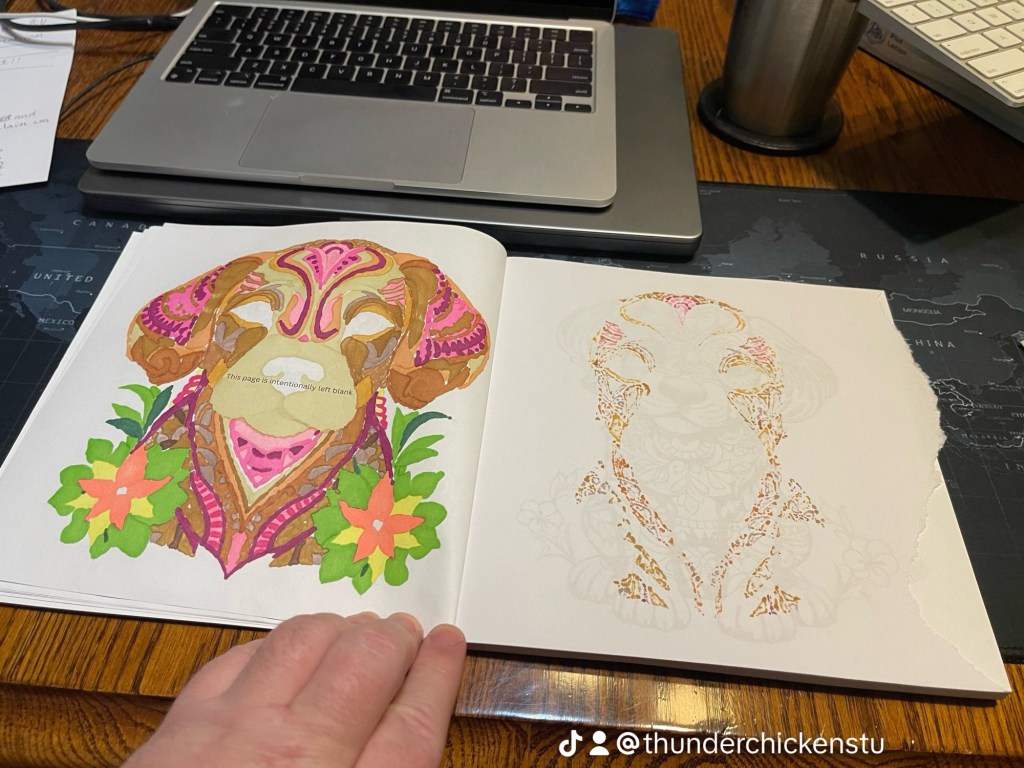 The coloring pages in Puppy Therapy work great with Ohuhu alcohol-based markers. Just make sure to put an extra sheet of paper behind the pup you are coloring to prevent bleed-thru. The coloring pages are all single-sided for just this reason!